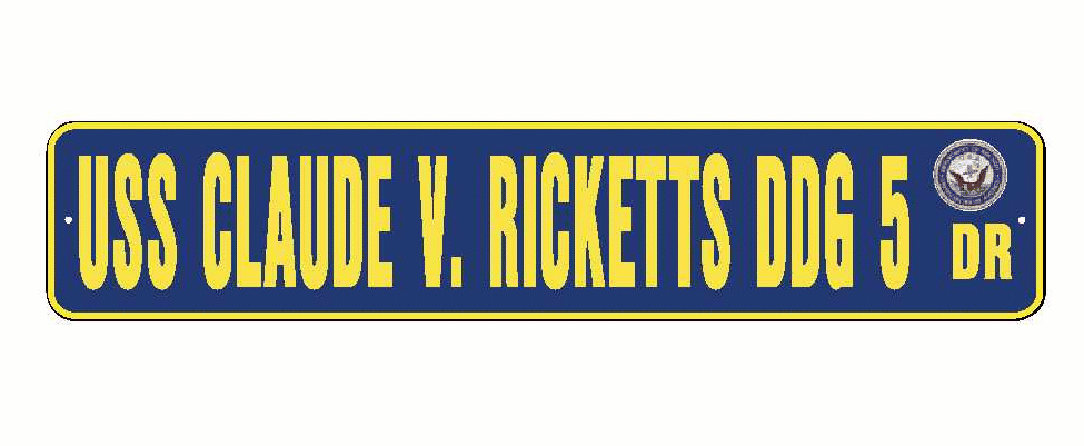 USS CLAUDE V RICKETTS DDG 5 Aluminum Street Sign Navy Blue / Yellow 6" x 30" Military USN SS002