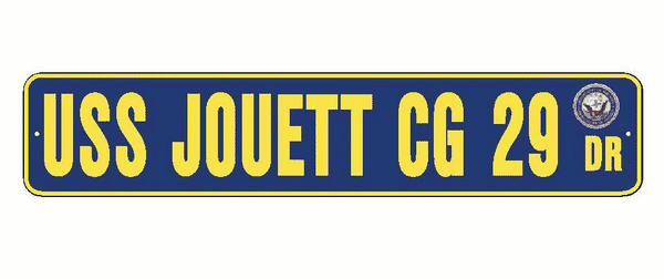 Vendor: American Military Graphics USS JOUETT CG 29 Aluminum Street Sign Navy Blue / Yellow 6" x 30" Military USN SS002 (Copy) Sale price $27.99Regular price $29.99