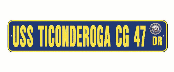 Vendor: American Military Graphics USS TICONDEROGA CG 47 Aluminum Street Sign Navy Blue / Yellow 6" x 30" Military USN SS002 Sale price $27.99Regular price $29.99