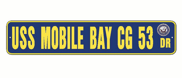 Vendor: American Military Graphics USS MOBILE BAY CG 53 Aluminum Street Sign Navy Blue / Yellow 6" x 30" Military USN SS002 Sale price $27.99Regular price $29.99