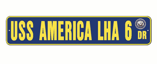 USS AMERICA LHA 6 Aluminum Street Sign Navy Blue / Yellow 6" x 30" Military USN SS002
