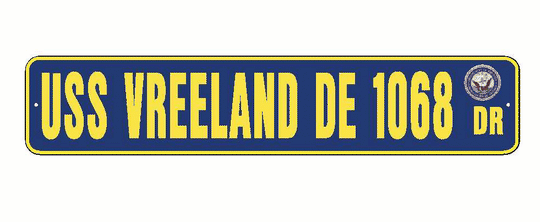 Vendor: American Military Graphics USS VREELAND DE 1068 Aluminum Street Sign Navy Blue / Yellow 6" x 30" Military USN SS002 Size: 6" X 30" 2 pre-drilled holes for hanging. Material: .080 Aluminum Color: Navy Blue / Yellow with Navy SealSale price $27.99Regular price $29.99