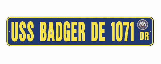 Vendor: American Military Graphics USS BADGER DE 1071 Aluminum Street Sign Navy Blue / Yellow 6" x 30" Military USN SS002 Size: 6" X 30" 2 pre-drilled holes for hanging. Material: .080 Aluminum Color: Navy Blue / Yellow with Navy SealSale price $27.99Regular price $29.99