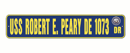 Vendor: American Military Graphics USS ROBERT E PEARY DE 1073 Aluminum Street Sign Navy Blue / Yellow 6" x 30" Military USN SS002 Size: 6" X 30" 2 pre-drilled holes for hanging. Material: .080 Aluminum Color: Navy Blue / Yellow with Navy SealSale price $27.99Regular price $29.99