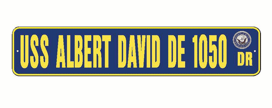 Vendor: American Military Graphics USS ALBERT DAVID DE 1050 Aluminum Street Sign Navy Blue / Yellow 6" x 30" Military USN SS002 Size: 6" X 30" 2 pre-drilled holes for hanging. Material: .080 Aluminum Color: Navy Blue / Yellow with Navy SealSale price $27.99Regular price $29.99