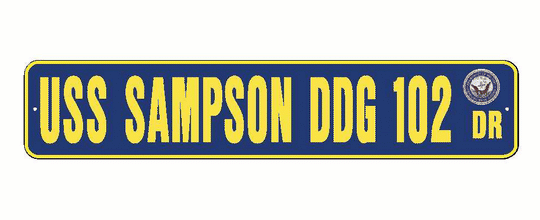 Vendor: American Military Graphics USS SAMPSON DDG 102 Aluminum Street Sign Navy Blue / Yellow 6" x 30" Military USN SS002 Size: 6" X 30" 2 pre-drilled holes for hanging. Material: .080 Aluminum Color: Navy Blue / Yellow with Navy SealSale price $27.99Regular price $29.99