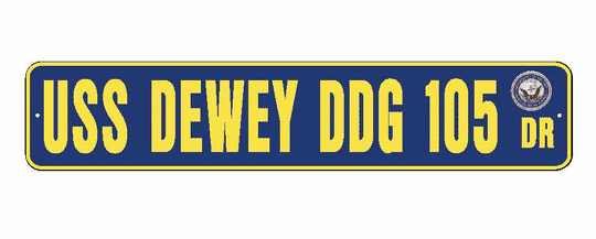 Vendor: American Military Graphics USS DEWEY DDG 105 Aluminum Street Sign Navy Blue / Yellow 6" x 30" Military USN SS002 Size: 6" X 30" 2 pre-drilled holes for hanging. Material: .080 Aluminum Color: Navy Blue / Yellow with Navy SealSale price $27.99Regular price $29.99